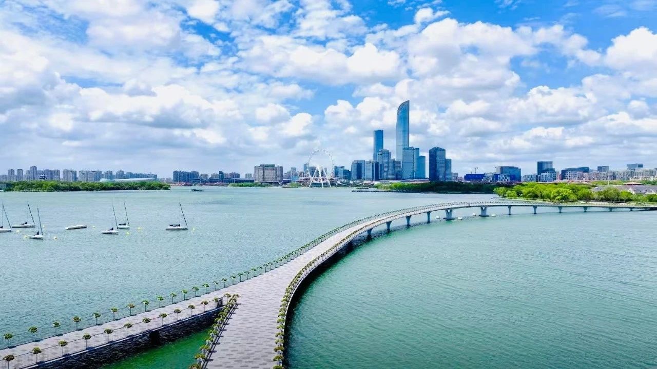蘇州工業園區河道縱橫、水網密布,金雞湖及周邊區域水清岸美、城水相依,勾勒出了一幅“人水和諧”的生態畫卷。