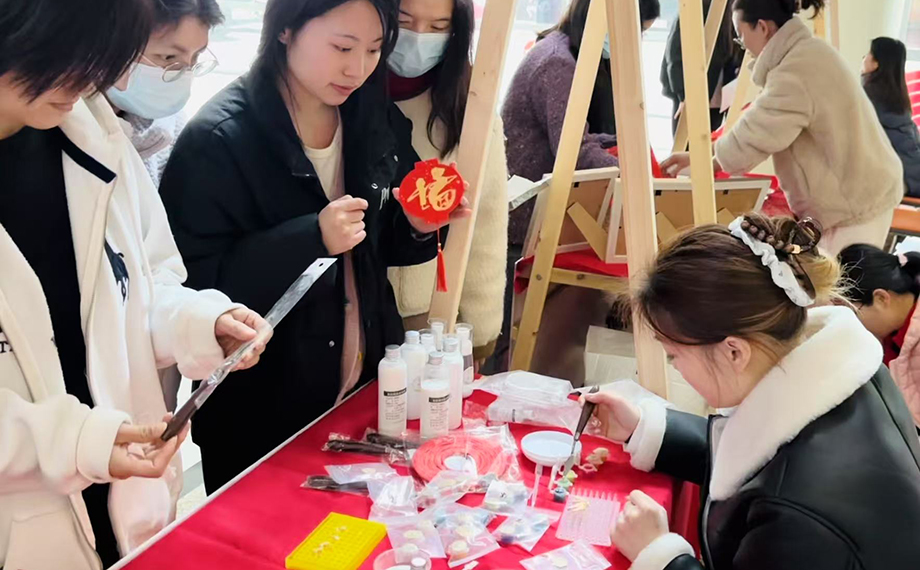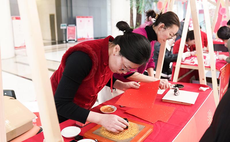 今年是中國春節申遺成功后的首個“非遺版”春節,非遺文化是此次活動的一大亮點,在非遺互動體驗區,樓宇企業員工們熱情參與木刻版畫拓印、銅胎掐絲琺瑯等傳統技藝體驗,親手制作新春年畫、精美飾品等,感受非遺文化的獨特魅力。