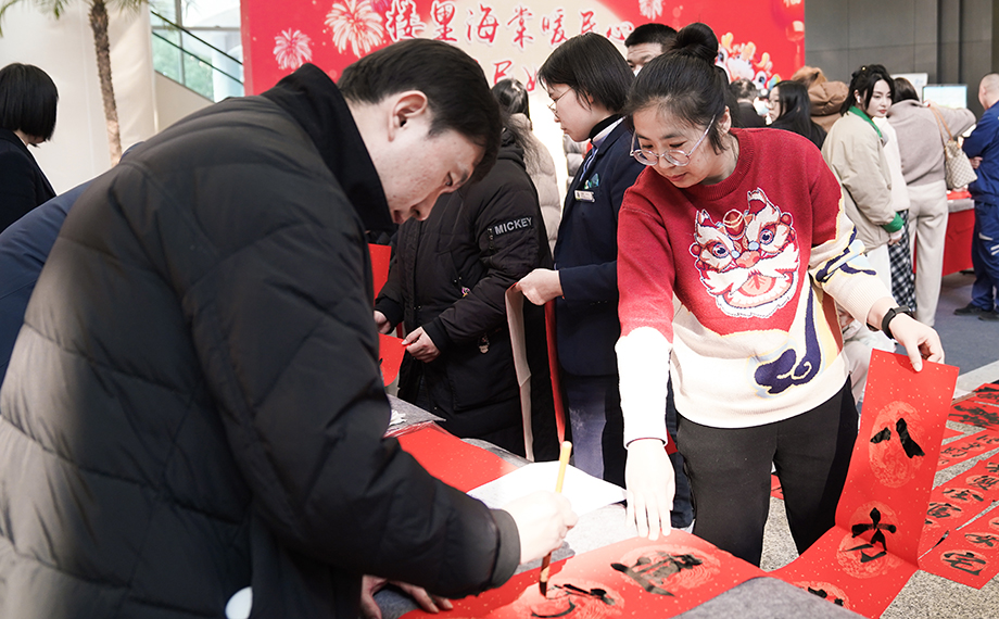 活動現場一片歡樂祥和的節日氛圍,前來領取春聯及福字的員工絡繹不絕,大家手捧著新鮮出爐的春聯,臉上洋溢著幸福的笑容,對書法家們的精湛技藝贊不絕口。一位在國際大廈工作的員工表示:“在超市選購春聯雖然方便,但現場手寫的春聯更有溫度、更有年味。我拿到了一副很合我心意的手寫春聯,一定要把這份福氣帶回家。”短短兩個小時內,現場就送出了約500副春聯和500個福字,將滿滿的福氣傳遞到每個人手中。