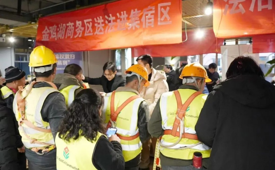 2月12日,元宵節當天,金雞湖商務區黨工委、兩新工委聯合蘇州方正科技發展有限公司,以第十九屆“農民工學法活動周”為契機,開展送法進集宿區活動,為集宿區員工及周邊建筑工人送去法治關懷與節日溫暖。