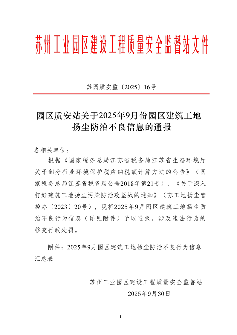 園區(qū)質(zhì)安站關(guān)于2025年9月份園區(qū)建筑工地?fù)P塵防治不良信息的通報(bào)