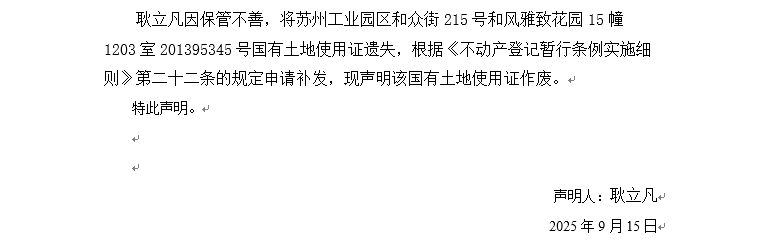 關于蘇州工業園區和眾街215號和風雅致花園15幢1203室201395345號國有土地使用證遺失聲明