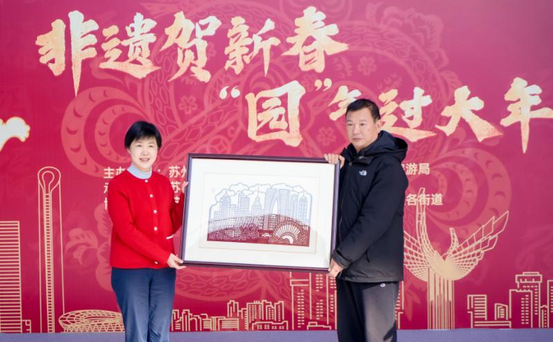 活動(dòng)中,多位非遺大師帶來各自的新春作品,涵蓋緙絲、刺繡、剪紙等形式,向大家展示非遺年禮的美好寓意。其中,蘇州市工藝美術(shù)大師、蘇州民間工藝家、蘇州市非遺代表性傳承人金國榮還向蘇州工業(yè)園區(qū)捐贈(zèng)了真絲彩繪套色剪作品《潮園區(qū)》,為園區(qū)再添一抹獨(dú)特的文化色彩。