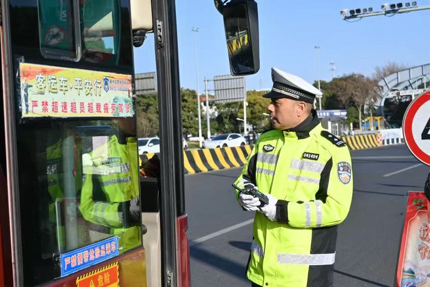 望著常臺(tái)高速城區(qū)出入口忙碌的車流,交警嚴(yán)愛華遠(yuǎn)遠(yuǎn)示意一輛即將進(jìn)入高速的外市號(hào)牌大巴車靠邊停車接受安全檢查。2025乙巳蛇年春節(jié),是園區(qū)公安分局交警大隊(duì)婁葑中隊(duì)中隊(duì)長嚴(yán)愛華在公安交管崗位上值守的第29個(gè)新春假期。