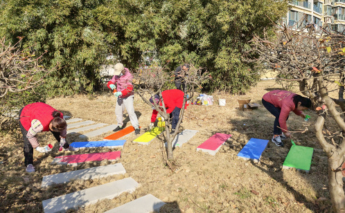 新春之際,為提升居民幸福感歸屬感,社區組織居民志愿者開展一平米·彩芽繪夢活動,對局部褪色、暗淡的小區步道進行美化。志愿者們積極響應、主動集結,手執畫筆,分工協作。一筆一畫勾勒線條,一點一滴填充色彩,原本斑駁的一平米步道,在大家的巧手裝扮下,重新煥發生動色彩。這“微更新”不僅提升了社區“顏值”靚色,也讓居民們在共同勞動中增強了主人翁意識,匯聚起鄰里協作的強大力量,生動體現了“做成一件事”到“提升一群人、改變一個社區、形成一種生態”的治理理念。