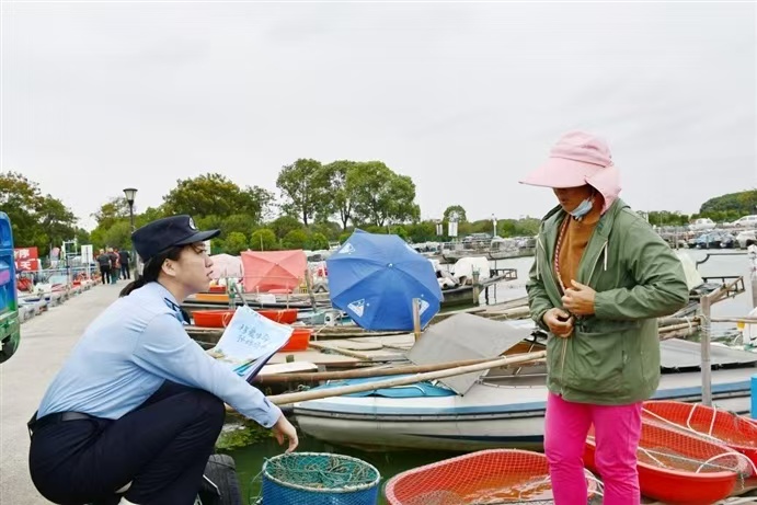 日前,蘇州工業園區公安分局陽澄湖半島派出所民警至轄區陽澄湖漁船碼頭開展走訪宣傳,同步進行防范宣傳。